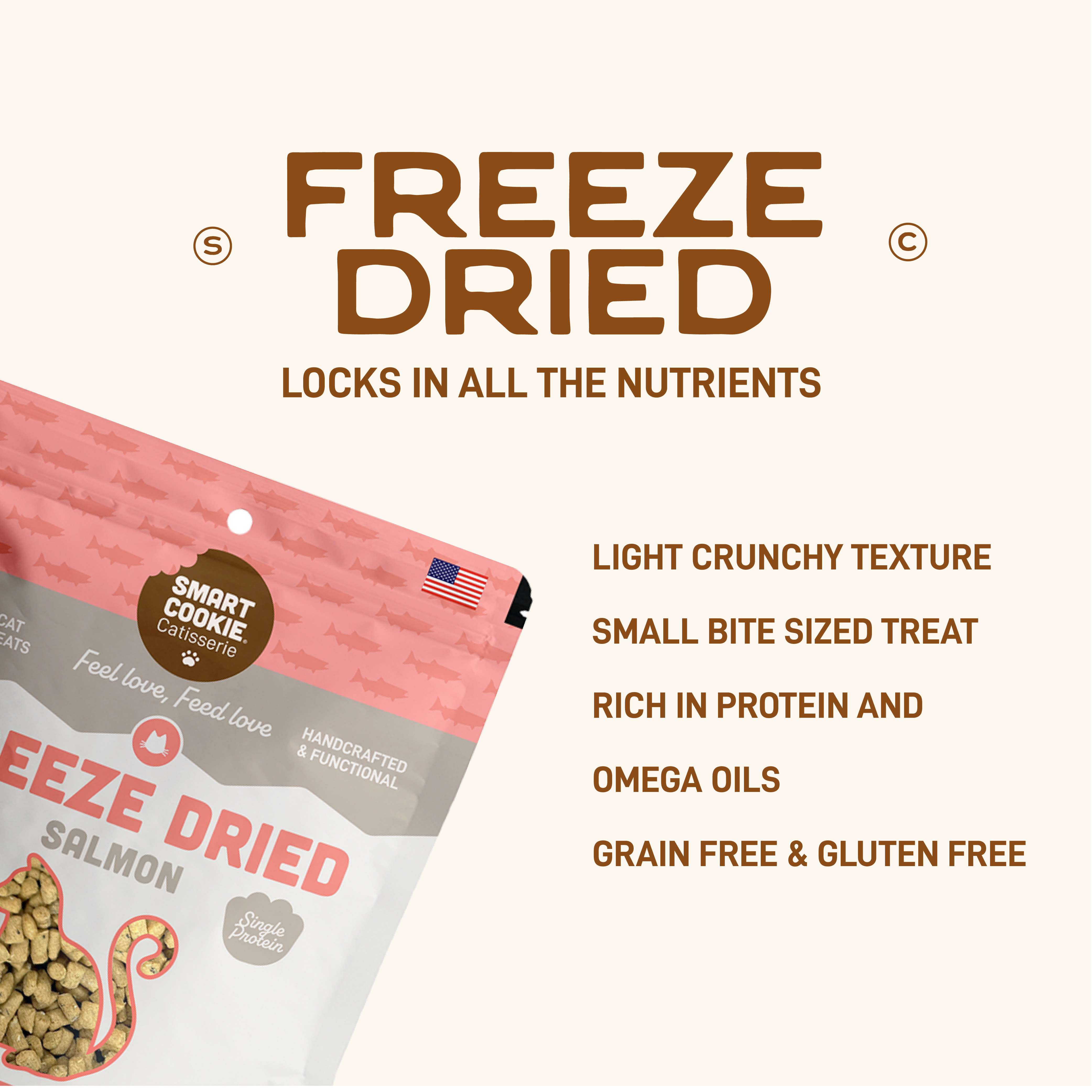 These freeze dried salmon cat treats are made with wild-caught salmon and deliver protein and Omega-3s to support healthy skin and coat. Freeze dried to preserve nutrients and flavor, they’re ideal for cats with sensitivities or selective tastes. Pure, simple, and handcrafted in the USA—a delicious and healthy way to bond daily
