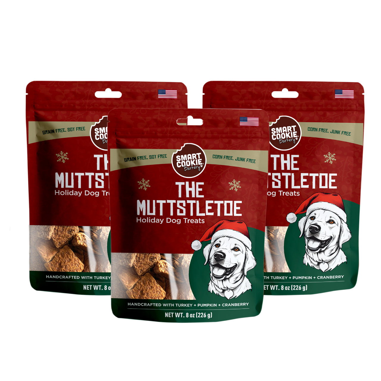 The Muttstletoe, our seasonal holiday dog treat, has all the fixin's! Hearty turkey, velvety pumpkin and yummy cranberries makes a warm celebration of fall and winter wrapped up in a bag of treats. We know you're drooling, and your dog will too.