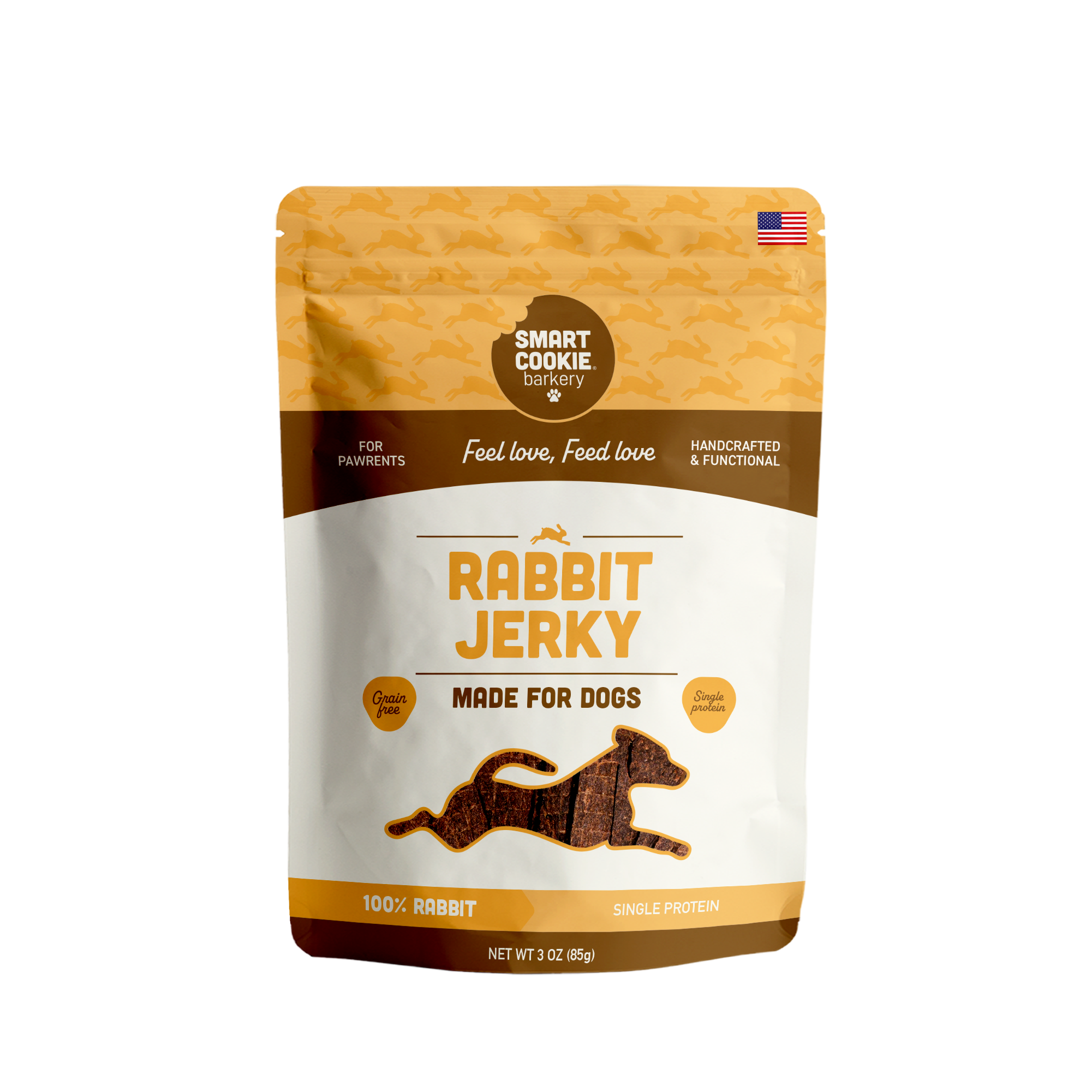 4 bags of single-ingredient rabbit jerky—handcrafted & hypoallergenic.