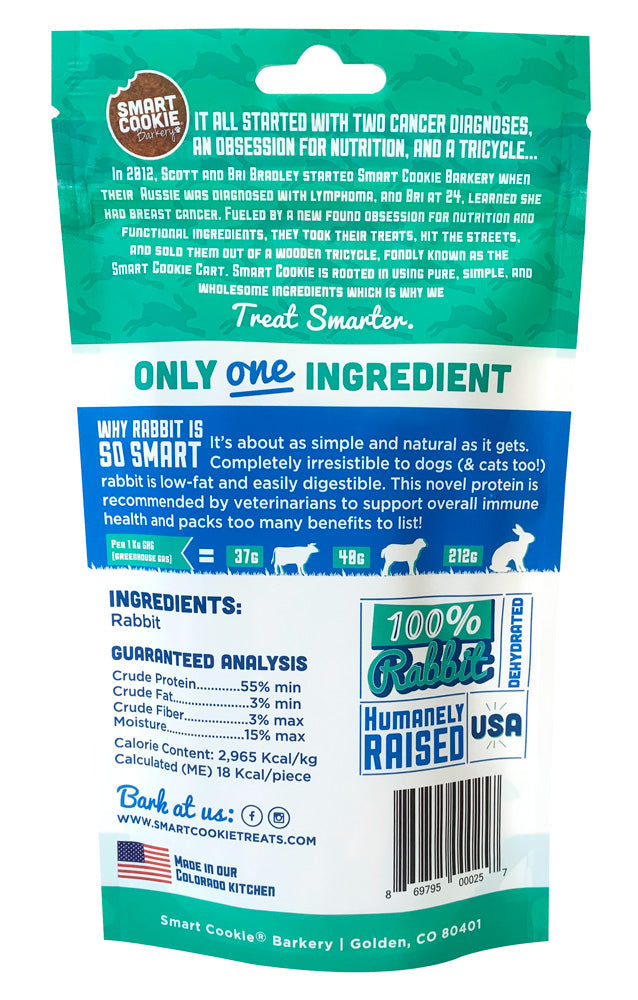 These rabbit jerky treats for dogs are made with just one ingredient: real rabbit meat. A clean, grain-free option for dogs with allergies or sensitivities, they’re the perfect choice for picky eaters. This novel protein treat is hypoallergenic, low in fat, and handcrafted in small batches in the USA. Smart Cookie rabbit dog treats are healthy, simple, and always delicious.