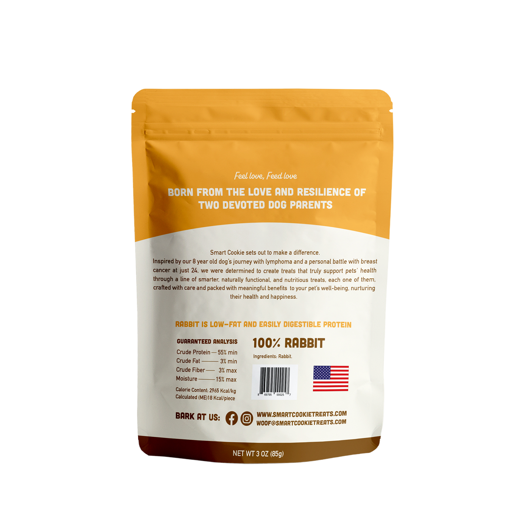 Same iconic Smart Cookie rabbit jerky—just cut into small, easy-to-use pieces. These rabbit jerky treats for dogs are made with 100% real rabbit meat and nothing else. A novel protein that’s perfect for training, rewarding, or treating picky eaters and sensitive pups. Grain-free, low-fat, and hypoallergenic, handcrafted in small batches in the USA.