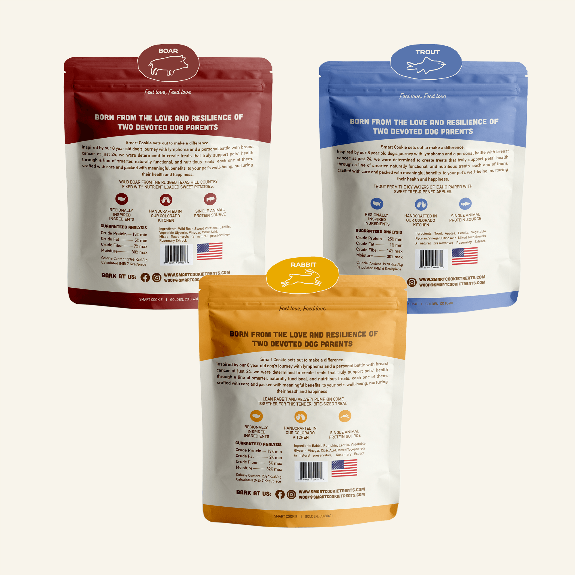 Three soft & chewy treats—each made with a single, real protein: Rabbit, Trout, or Wild Boar. Crafted with limited ingredients for sensitive pups and picky eaters.