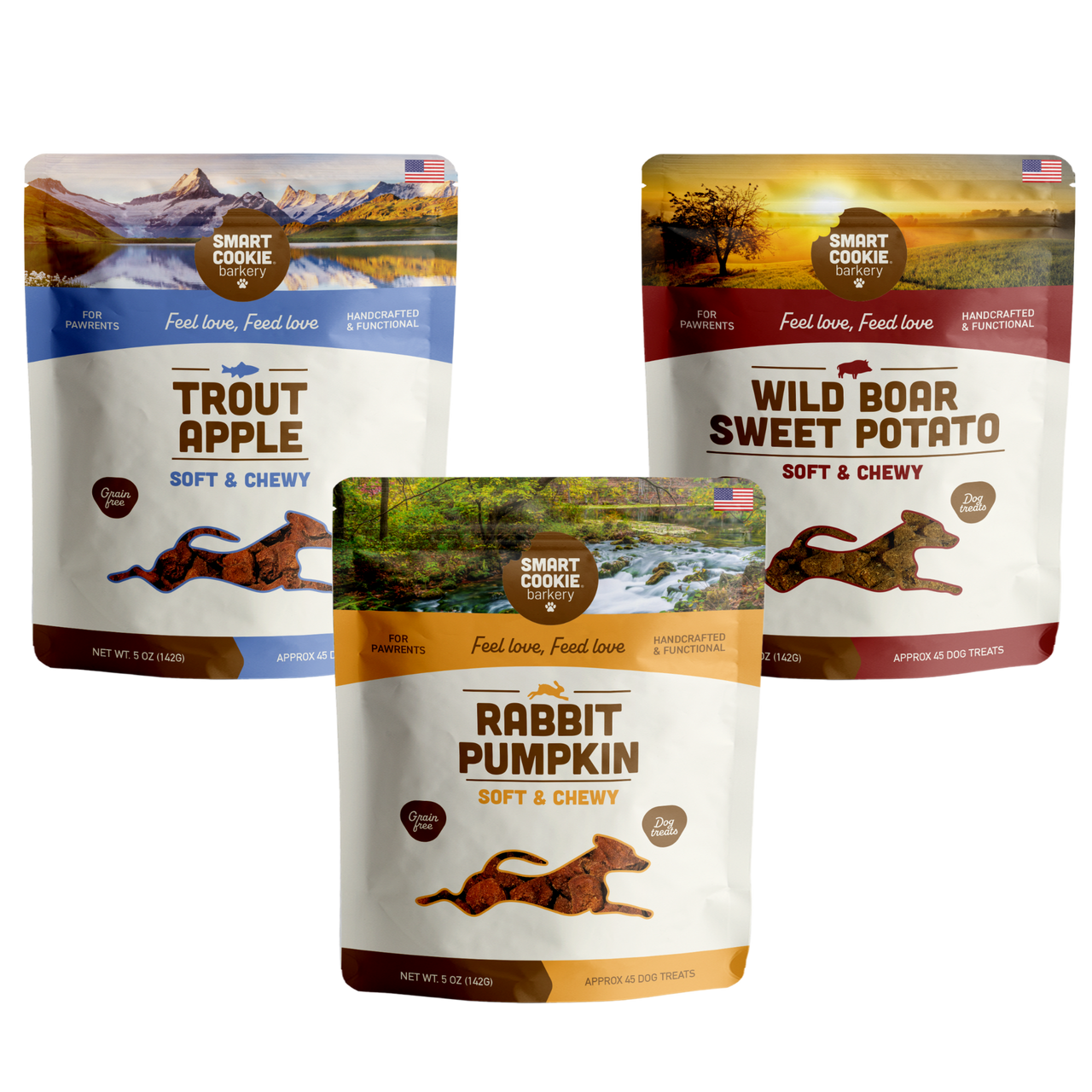 Made with real rabbit, trout, and wild boar, this trio of soft & chewy treats is crafted with single proteins and limited ingredients, perfect for dogs with food sensitivities or picky appetites. Grain-free, low in fat, and full of flavor, each treat is handcrafted in small batches in the USA for healthy, tail-wagging rewards.