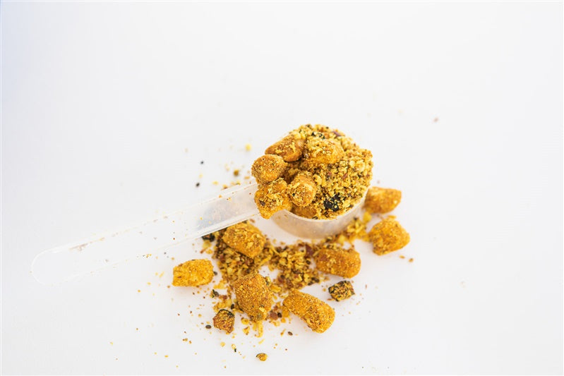 Freeze Dried Salmon, Quinoa, Flax Seed, Coconut, Roasted Peanuts, Chia Seed, Bluberries, Turmeric, Mixed Tocopherols (a natural preservative)
