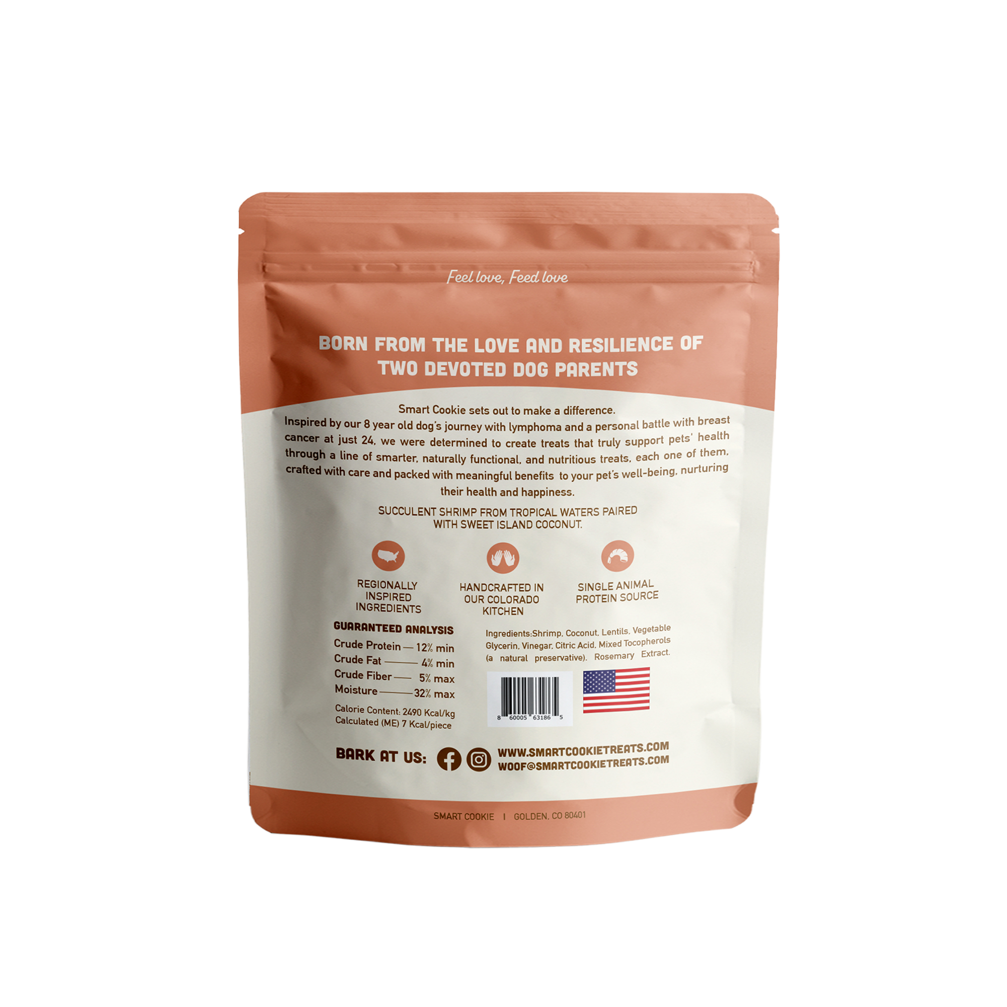 These soft dog treats are made with wild-caught shrimp and sweet coconut, blending tropical flavor with functional benefits. With limited ingredients and a grain free recipe, they’re perfect for dogs with allergies or sensitive stomachs. These natural dog treats are soft, chewy, and easy to break for training or daily rewards. Handmade in small batches in Colorado, they’re your go-to seafood dog treats for healthy, happy pups.
